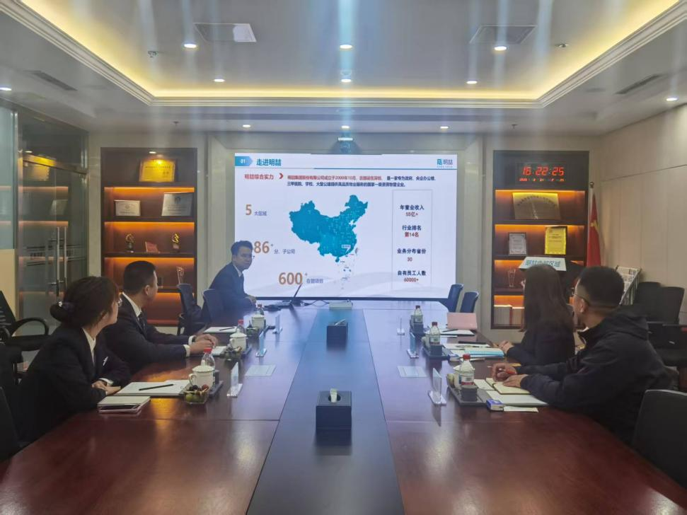 明喆集团中部区域副总经理王猛、中部区域总经理助理兼人资部经理李云龙、招聘和培养专员郭晨旭热情接待学院一行,详细介绍了企业发展历程、业务布局、企业文化及人才培养体系,并通过企业宣传片、技能比武视频,全方位展示企业运营模式、岗位需求与人才发展路径,让学院一行直观了解企业对人才的专业能力、职业素养要求。企业重点推介了项目经理、职能管理等优质岗位,并介绍了岗位任职条件、发展空间与薪酬福利体系,并表示尽快启动面向中德应大的校招工作。