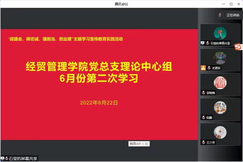 2022年6月22日晚7:00,经贸管理学院党总支召开6月份第二次中心组学习扩大会议,学习了天津市委书记李鸿忠同志在中国共产党天津市第十二次代表大会上的报告。参加学习的包括党总支全体委员、各党支部书记、副书记,共9人。本次中心组学习由党总支书记石莹同志主持。