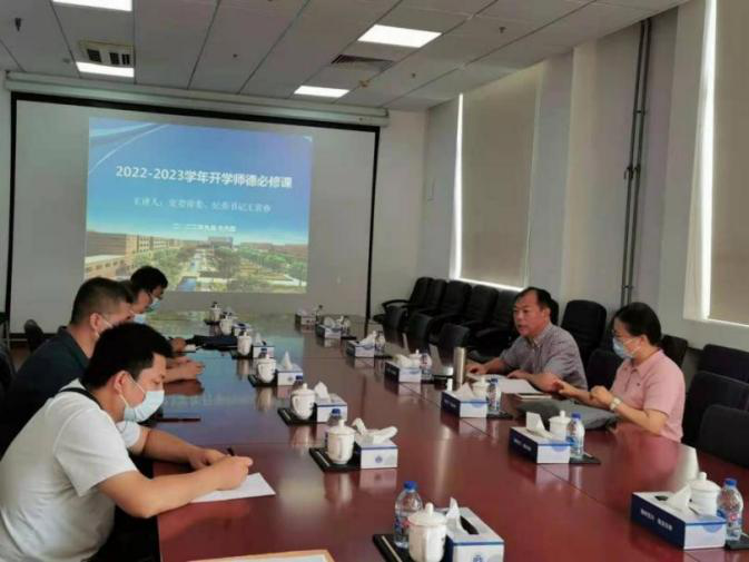 首先,王景春书记带领大家学习了习近平总书记对于师风师德的内涵和意义的重要论述和重要讲话精神,解读了教育部“六禁令”“红七条”等国家师德师风重要文件,详解讲解了2021年印发的《天津中德应用技术大学师风师德考核管理办法》的文件内容,最后通过一些警示教育典型案例敲响警钟,他希望广大教师积极响应习近平总书记号召, 努力成为学生锤炼品格的引路人、学习知识的引路人、创新思维的引路人、奉献祖国的引路人,成为有理想信念、有道德情操、有扎实学识、有仁爱之心的“四有”好老师。