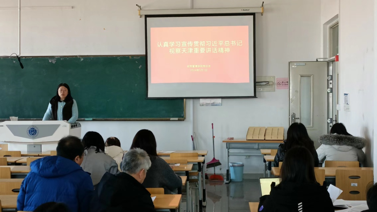 2024年3月1日下午2点在F3-424,经贸管理学院党总支组织开展了学习贯彻习近平总书记视察天津重要讲话精神宣讲。由党总支书记石莹同志面向经贸管理学院全体教职工进行宣讲。