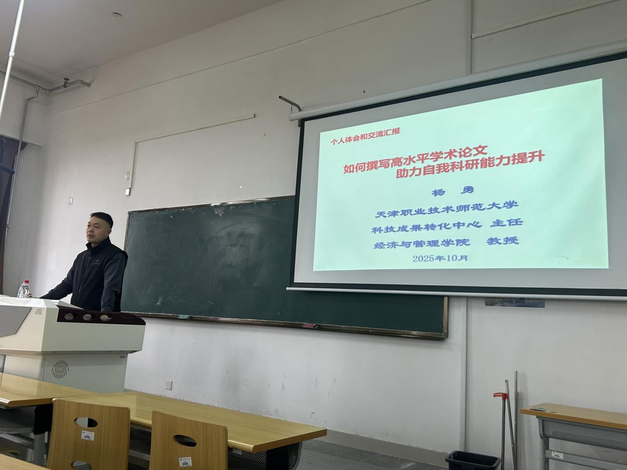 2025年11月7日下午,天津中德应用技术大学经贸管理学院特邀天津职业技术师范大学经济与管理学院杨勇教授,在F3-424教室开展了题为《如何撰写高水平学术论文 助力自我科研能力提升》的专题学术讲座。杨勇教授现任该校科技成果转化中心主任,曾到美国阿肯色大学做访问学者,兼任中国环渤海经济研究会理事、天津物业协会专家等职务,在人力资源管理、区域经济及职业教育领域具有丰富的研究经验。本次讲座经贸管理学院50余名教职工到场聆听。